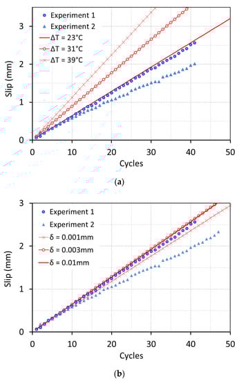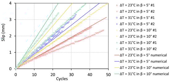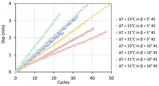 For all conditions of the experiments, it is observed the slip values of the acryl plate over the wood slope are continuously growing. The amounts of slip are different, but they all linearly increase as the temperature fluctuation cycle continues. In general, the amount of accumulated slip becomes greater with a higher amplitude of temperature change and a larger inclination angle. The accumulated slip magnitudes are ranging from ( in slope) to ( in slope) after the 36 cycles. There are minor discrepancies in the results from the same experimental condition (i.e., same and ), but the overall tendency of the test results is consistent. As the slip increase is observed to be linear, the slip values after extended cycles can also be predicted via extrapolation of the first 20 cycles or so. In summary, the experimental results help to ascertain the ratcheting behavior of the slip growth and imply that the amount of slip will never be reduced down later (Figure 2).