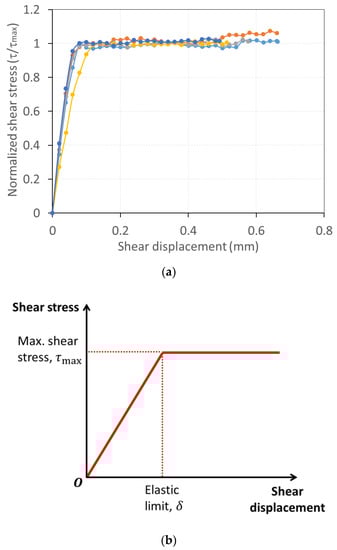 Results of the direct shear test at the acryl-wood interface; (a) normalized shear stress versus shear displacement from the multiple direct shear tests under the various range of normal stresses (results shown here are for 10 kPa of normal stress as an example), and (b) conceptual idealization of the direct shear test result.