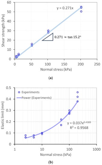 Results of the direct shear test at the acryl-wood interface; (a) determination of the frictional coefficient (), and (b) elastic limits of the shear displacement ( ) under various normal stresses and their regression fitting.