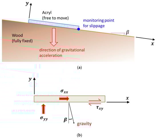 The finite element model is constructed accordingly in the plane strain condition using Abaqus (Figure 5a). Note that a comparison between the two-dimensional plane strain and three-dimensional simulations is discussed in a later section. The acryl and wood in the simulation model are set as linear elastic materials with the representative mechanical and thermal properties listed in Table 1. The interface is treated as linear elastic-perfectly plastic using the Coulomb frictional model. The coefficient of friction () and the elastic slip () are applied to the interface of those two materials. The wood is assumed not to deform against gravity nor temperature fluctuations, thus fully fixed in all directions, whereas the acryl plate as a sliding slab is not constrained at all. Similar to the experiment, the acryl plate is placed on the wood slope inclined at an angle of , and only a gravitational acceleration is applied. Then, the temperature of the acryl plate is increased by and then decreased by the same temperature change (). The combination of temperature increase and decrease of the acryl plate is deemed one cycle of temperature fluctuation, and up to 50 temperature cycles are applied to the acryl plate during the numerical simulation. Similar to the experimental conditions, two cases of temperature changes ( and ) and two cases of the inclination angles ( and ) are considered in the simulations for comparison with the experimental outcomes. The slip accumulation is monitored at the front end of the acryl plate (Figure 5a). Moreover, the stress values, along with the slip, are to be presented in the next section (following the definitions in Figure 5b). That is, is the normal stress acting parallel to the slope surface, is the normal stress acting perpendicular to the slope surface, and is the shear stress between the acryl and the wood. All of these stress values are monitored at the base of the acryl. The positive normal stresses represent tensile values as per traditional mechanics and the negatives are for compressive ones. The positive shear stress denotes downward shear stress on the acryl side, which is the same as the one shown in Figure 5b.