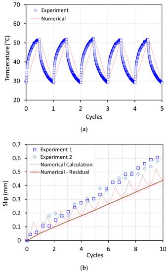 Comparison of the experiment and the simulation results with in slope. (a) Temperature cycles during the actual experiments and the numerical simulations, and (b) slip accumulation of the acryl vs. temperature cycles.