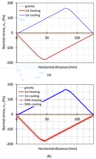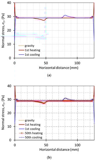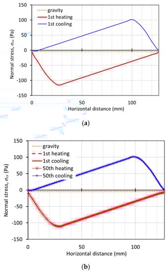 First, the distributions of normal stress in a direction parallel to the slope surface () on the acryl plate are shown in Figure 8. Normal stress with gravitational loading only is presented as a dotted-orange line (Figure 8), which magnitude is much smaller than that when any temperature changes are imposed. The distribution of normal stress with gravity appears nearly uniform, and the magnitude is around . With a temperature increase (labeled as “heating”), the distribution of normal stress () becomes negative (compressive), non-uniform, and concave-up with approximately of the peak at around from the left end and nearly at both left and right ends of the acryl plate (a red line in Figure 8a). It implies that, when the acryl is heated, the entire acryl plate is under compressive stresses, caused by the constraint of the frictional resistance between the acryl and the wood, namely, interface shear strength against thermal expansion behavior.