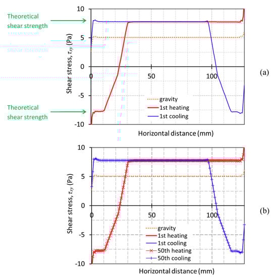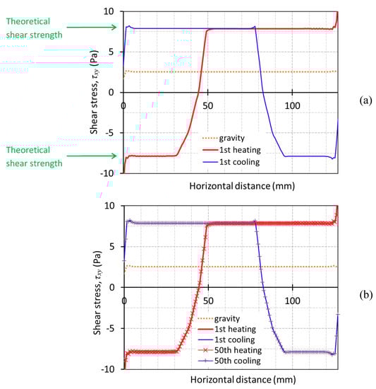 Once the temperature of the acryl drops back to the initial value (labeled as “cooling”), the normal stress () becomes positive (tensile) and its distribution in the plate is concave-down with the peak of around from the left end of the acryl plate (a blue line in Figure 8a). In contrast to the heating cycle, the entire acryl plate is under tensile stresses with the temperature drop, and this is because the shrinkage of the acryl plate is obstructed by the interface shear stress. It is also observed that the distribution shapes and the stress magnitudes do not change as the temperature cycle continues. For instance, the distributions at the 50th cycle of temperature fluctuation are essentially the same as those of the first cycle (Figure 8b; the distributions at the first and 50th cycles are completely overlapped). With such a constant distribution of normal stresses, we can postulate that the locations of the maximum and the minimum normal stresses (i.e., and from the left end, respectively) are approximately the “neutral points”. This will be discussed further in the next paragraph.