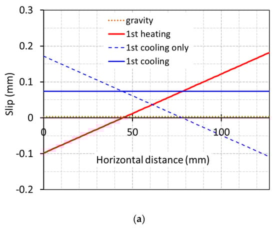 The distribution of the interface slips at the acryl-wood interface is described in Figure 11. Positive values of the slip denote the downhill direction, whereas negative ones for the uphill movement. Slip by the gravitational loading only is negligible, as shown in Figure 11a (a dotted line; approximately ). When the temperature is increased, the slip distribution at the interface is linear, from to (from the left end to the right, a dashed line in Figure 11a). The location of zero slip appears to be approximately , which coincides with the neutral point identified from the interface shear stress distribution (Figure 10). When the acryl plate is cooled back, the slip distribution is flipped over from to (from the left end to the right, a dot-dash line in Figure 11a), which shows another neutral point at . The overall distribution of the slip after the combined heating–cooling cycle is approximately constant at (a blue solid line in Figure 11a), which is fundamentally an irrecoverable, residual slip that is also shown in Figure 6b and Figure 7.