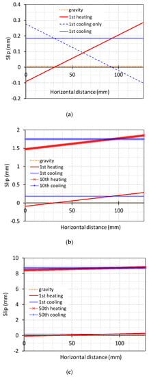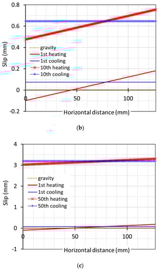There is a major difference found between the stress distributions (i.e., normal and shear) and the slip distribution; the slip distribution has an increasing magnitude with the repetition of the temperature cycle, whereas the stress distribution does not. As noted earlier, the same stress distribution shape during the temperature cycles implies that the locations of the neutral points are the same. The irrecoverable slip occurs even from the first heating–cooling cycle, which implies that the slip will continue to accumulate as the temperature cycle repeats. Moreover, the magnitude of the irrecoverable slip at each heating–cooling cycle must be the same, given that the stress values are identical during all the cycles. Therefore, the irrecoverable slip will continuously grow with the temperature cycles, and it should be linearly growing. For instance, the irrecoverable slip is with the gravity, at the first cycle, at the 10th cycle, and then at the 50th cycle (solid lines in Figure 11b,c), which is approximately .