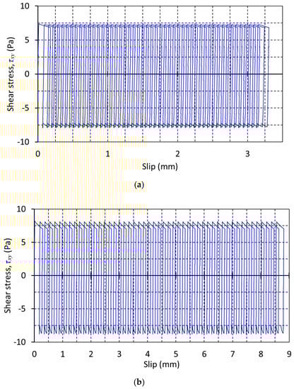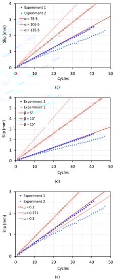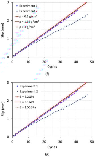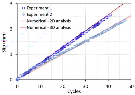 Comparisons of the experimental outcomes and the numerical results are summarized in Figure 7. The accumulated slip values after 20 cycles range from ( in slope) to ( in slope). These are somewhat close to that of the experiments ranging from ( in slope) to ( in slope). Apparently, there are certain discrepancies in the magnitudes of the accumulated slips. Nonetheless, the experimental outcomes and the numerical results can be regarded to be reasonably in good agreement in the aspect that the slip values all consistently and linearly increase, and the errors between the experiment and the simulation results are comparable to those between two experimental tests at the same condition.