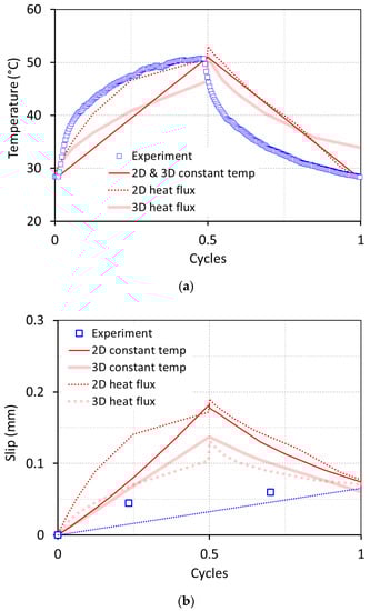 Another approximation made in the numerical model is how the heating is applied to the acryl plate. In the experiments, the top of the acryl plate is heated by the heating pad attached to it. Then, the entire acryl plate is heated by the heat conduction, resulting in a temperature gradient in the transverse direction. On the other hand, the temperature of the entire acryl plate is increased at the same rate in the numerical model (that is, no temperature gradient). Hence, simulations in which a heat source is imposed at the top surface would rather reflect heat flux, and thus the transient temperature change in the acryl better. Simulations with such a setting were also conducted, and we compared the results in both 2D and 3D conditions; temperature inputs at the bottom of the acryl plate over the heating–cooling cycle are described in Figure 18a. There are no significant differences between the cases of experimentally measured one, simulation with constant temperature change, and simulation with transient temperature change. The residual slip, on the other hand, show much less difference. The slip values are and from the 2D and 3D analyses with the constant temperature change and and for the 2D and 3D analyses with the transient temperature change. The direct experimental value is not available but can be estimated as based on the trend line (a dotted blue line) of experimental observation.