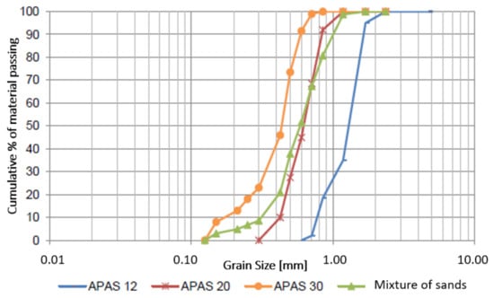All the mortars were prepared with an industrial powder hydrated air lime (CL), classified as CL90-S by EN 459-1 [] and produced by Lusical, Lhoist group, Portugal. The same CL was also used in previous studies, such as Gameiro et al. [] where the chemical composition can be seen, Andrejkovičová et al. [], Cardoso et al. [], Faria & Martins [] and Faria et al. []. The aggregate was obtained by mixing three types of washed and calibrated silica sands with different granulometry (APAS 12, APAS20, and APAS30, from Areipor) with a volume ratio of 1:1.5:1.5, respectively. The particle size distribution of each sand and the sand mixture (S) can be seen in Figure 1. The Mk used in the modified mortars was an artificial pozzolana, Argical M 1200S, from IMERYS, and it was obtained from micronizing and calcining a kaolinitic clay. The chemical composition of the Mk that was used was assessed by Gameiro et al. []. The loose bulk density off all dry constituents of mortars, based on EN 1097-3 [], is shown in Table 2.