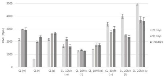 Dynamic modulus of elasticity (DME) of mortars with 0, 10 and 20% Mk replacing air lime, after 28, 90 and 180 days in maritime, humid and standard curing conditions.