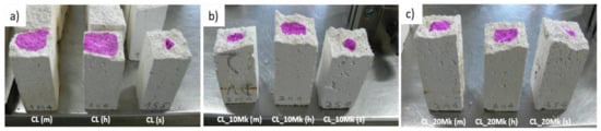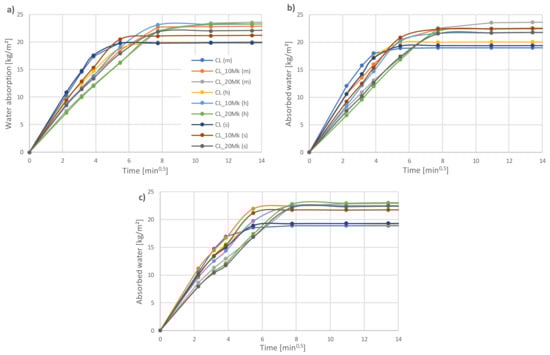In the capillarity water absorption test, samples of 40 mm × 40 mm × 70 mm in size were used. The test was carried out based on EN 15,801 []. Before starting the test, the samples were kept for at least 48 h in an oven at a temperature of 60 °C until they reached a constant mass value (corresponding to a variation of 0.1% mass within 24 h). The samples were removed from the oven and cooled at ambient temperature. They were wrapped in polyethylene film to waterproof their lateral faces and only allow water to be absorbed by a unidirectional capillary raise from the button. The test took place in a tank with saturated ambient conditions. Inside, a tray was placed and levelled, with a plastic net at the base (which ensures that the base of the samples was in contact with the water), filled with water up to a height of 5 mm and weighted after defined periods of time in contact with water. Water was added whenever necessary so that the height of the water remained constant. Capillary absorption curves were determined for each sample by weighing them until reaching an asymptotic value (Cs). For all mortars, the capillary coefficient (CC) was also calculated.
