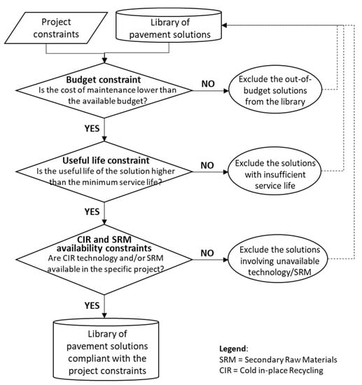 - evaluation of the compatibility of a library of designed pavement solutions involving secondary raw materials and cold recycling technologies with external imposed constraints.