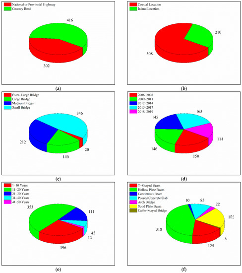 The cost associated with detecting bridge defects in coastal and inland areas of China, as determined by this study, is highly discrete and affected by a variety of factors. The data obtained is classified according to the six main factors (highway grade, bridge location, bridge grade, superstructure, bridge age, and detection time) that affect the cost of defect detection. The sample classification is presented in Figure 1; the total number of samples is 718.