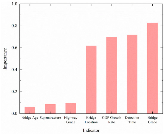 It can be seen from Figure 4 that four indicators (bridge grade, detection time, GDP growth rate, and bridge location) have importance values greater than 0.6. These four indicators are significantly more important than the remaining indicators of highway grade, superstructure, and bridge age, which have importance values of less than 0.1. Thus, the bridge grade, detection time, bridge location, and GDP growth rate were selected as the input indicators for the proposed prediction model.