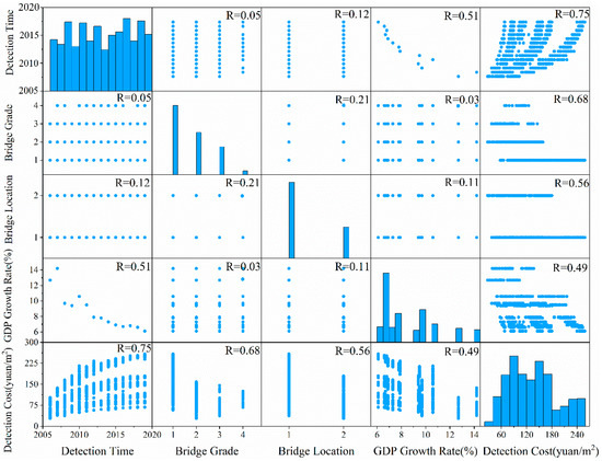 - Bayes’ modified confidence test was adopted to the outliers in the detection data that have a relatively large disparity with respect to the detection costs of similar bridges, and which may affect the prediction accuracy. The results show that 19 detection samples, constituting 2.6% of the total number of samples, were identified as outliers. These were replaced by the average value of similar data.