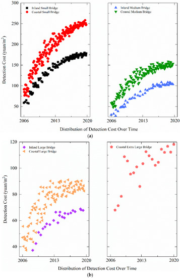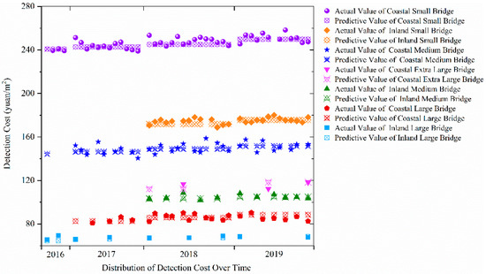 It can be seen from Figure 6 that the detection cost samples were divided into four categories according to the bridge grade: small bridge, medium bridge, large bridge, and extra-large bridge. Each category was then divided into two sub-categories according to the location (coastal or inland) of the bridge. Finally, the samples were sorted according to detection time. The sample values tend to decrease first and then increase as the bridge grade increases. The sample values of coastal areas in the same period are higher than those of inland areas, and the gap tends to expand with time. The sample values have a relatively obvious correlation with time, which shows that the method of predicting future detection costs based on the above classification is feasible.