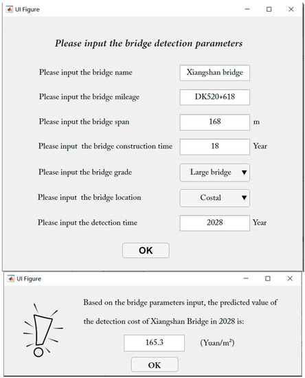 The results presented in this study demonstrate that the software developed in this paper can be applied successfully to predict the bridge defect detection cost. The developed software is simple to operate and easy to use, which can be used for rapid assessment of bridge life-cycle defect detection cost. Additionally, the software can help bridge management departments to formulate more economical bridge defect detection programs and can also be used to prepare bridge operating investment budgets. Countries or regions outside of China should use the local bridge defect detection cost database when using the software. Similarly, economic development indicators should also use the local GDP growth rate or other economic development indicators. Moreover, it is necessary to rescreen the input indicators of the model and software and use the exhaustive method based on grid search to reset the relevant parameters of the neural network, such as the number of network layers, the number of neurons in each layer, etc.