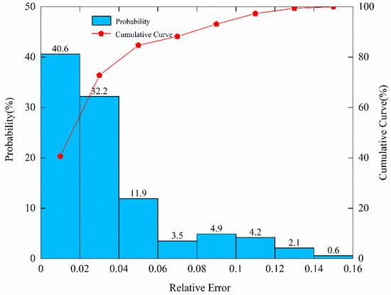 The relevant prediction error indicators are presented in Table 4, and the distribution of the relative error is shown in Figure 11. Table 4 indicates that the average error is 4.6 Yuan/m2, with a maximum error of 13.3 Yuan/m2 and a minimum error of 0 Yuan/m2. The average relative error is 3.41%, the maximum is 14.76%, and the minimum is 0%. It can be seen from Figure 11 that, for 83% of the prediction data, the relative error is less than 5%. For 93% of the prediction data, the relative error is less than 10%. The predicted values given by the model agree well with the practical values.