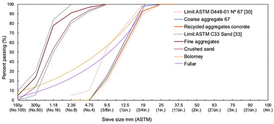 A previous step to the design of the concrete mix was to perform the granulometric analysis of the materials involved, such as the sieving analysis, rodded volumetric weight, loose volumetric weight, dry surface density, absorption, humidity, fineness modulus. In the granulometric analysis [28] for the materials is by the coding by size of the different fractions, the responsibility of UNE EN 933-2: 96 [29] is prescribed, which establishes as a basic sequence of sieves the one formed by the following: 0.063–0.125–0.250–0.500–1–2–4–8–16–31.5–63–125 mm. For fine aggregate, only sieves of the series are used. For coarse aggregate, use the 10–20–40 mm sieves together, which are included in the complementary R 20 series admitted by the indicated Standard [28,30].