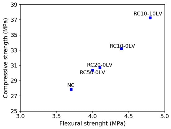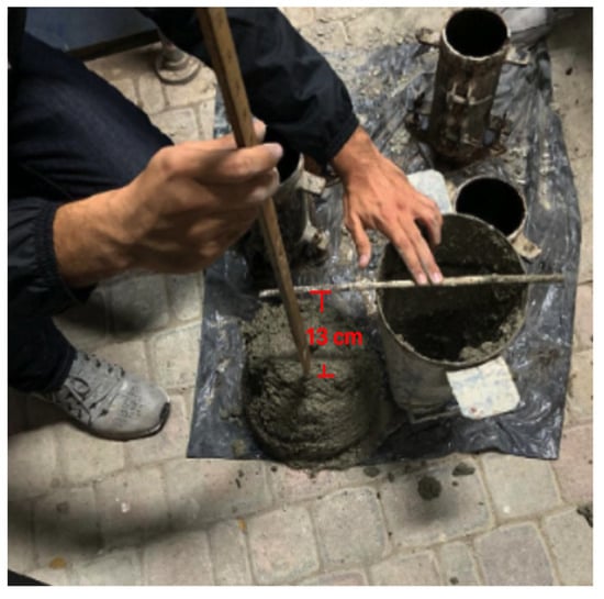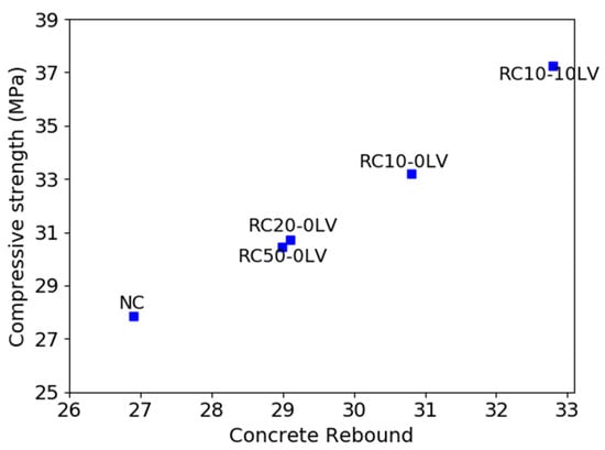 In this study, the fresh properties of conventional concrete mix (NC) and mixes with recycled concrete (RC10-0LV, RC20-LV, RC50-0LV, and RC10-5LV) were investigated, Figure 4. The slump test results for mixes containing different ratios of recycled concrete are listed in Table 6. As expected, the recycled crushed concrete has the same constituents. It can be noted that the recycled aggregate concrete does not influence the workability of the mixtures. Due to the same constituents in the crushed recycled concrete and the designed mixes, the slumps of concrete mixtures with and without recycled concrete are similar. The different mix designs fulfil the tolerances of the slump according to the Ecuadorian standard (INEN 1855 para 5.1.2.1) in which mentions that is required to maintain the workability at least for 30 min [31]. In the mix designs, the average values measured for the air content and the density were 1.9% and 2320 kg/m3, respectively.