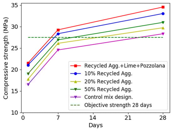 Studies have also focused on the enhancement in binding properties of cement and recycled aggregates [22,23,24]. Although previous studies have shown that lime and pozzolana can be regarded as reactive binders to improve the strengths and durability of concrete materials, and the mechanical properties of recycled concrete have been reported in the literature, the combination of recycled aggregate and these fillers received limited research attention even though they can provide enhanced strengths and sustainability of concrete materials. Moreover, due to the little practice with this recycled material in Ecuador, detailed studies on the properties of concrete materials incorporating natural lime and pozzolana are limited.