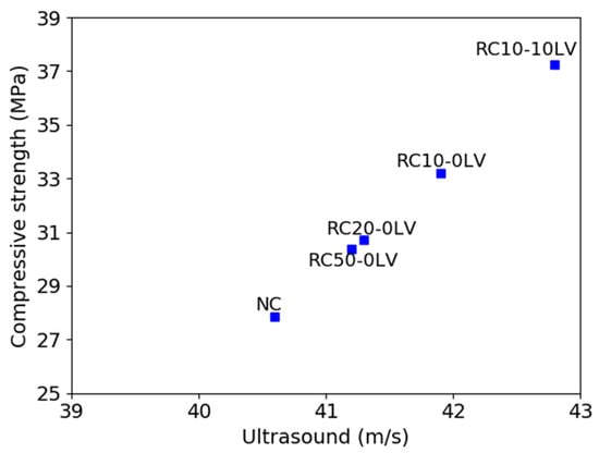 Figure 7 shows the ultrasound versus the compressive strength. This non-destructive test is a tool that helps to determine the concrete quality. It has been used in many countries instead of performing destructive tests such as compressive or flexural strength. It can be noticed that the concrete in all the mix designs presents a good condition according to the ultrasound test [37].