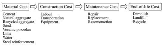 In this study, a life cycle cost analysis (LCCA) was carried out to investigate the benefits of using recycled concrete as alternatives to replace mineral aggregates in structural concrete. Considering the practical application of RAC, a prototype of reinforced concrete structure is accounted for in the LCCA. The LCCA model embedded in this study comprises the costs of four phases as shown in Figure 9. According to ISO 15686-5 [40], LCCA needs to cover a long enough period of time for the consideration of maintenance and end-of-life cost. A reinforcement ratio of 2% in the structural concrete prototype was chosen in order to assess the influence of recycled aggregate on each phase of the LCCA model.