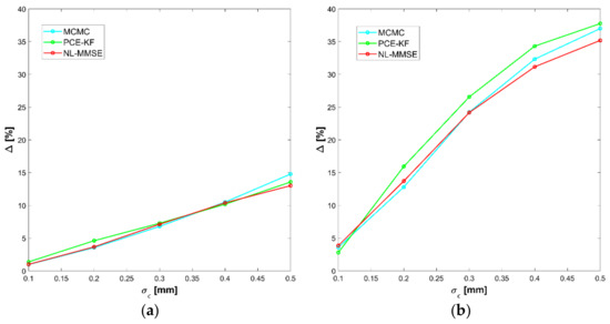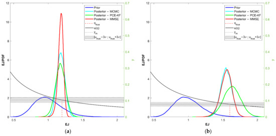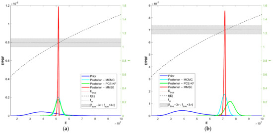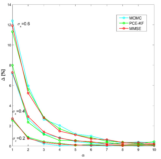 where is the Kalman gain that is calculated according to Equation (14) in an algebraic way, evaluating the covariance matrices directly from the PCE coefficients , and . It is important to notice that each new measurement enlarges the space we project onto [24,56]; thus, as the number of measurements increases, the number of PCE terms involved in the expansion grows and, consequently, so does the computational cost of the method. is described in the combined basis; therefore, before using Equation (15), and the deterministic values should be described in terms of this combined basis . More details about the implementation of the algorithm can be found in [24].
