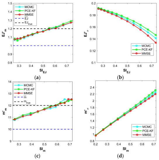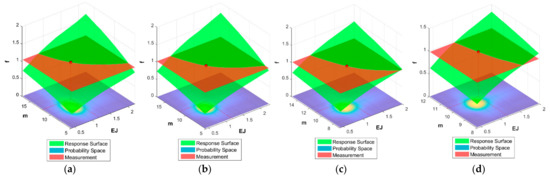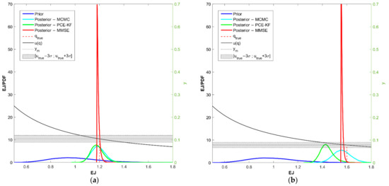 Assuming the input parameter is normally distributed , synthetic measurements are considered and are obtained by setting the true value of the input random variable to and . The measurement data were generated according to Equation (3), where was sampled from the distribution of the error which was set to be a normal distribution with zero mean and initial standard deviation .
