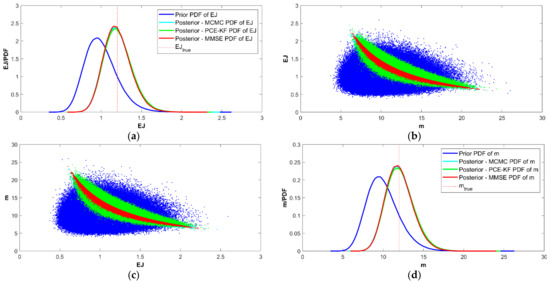 - The posterior PDFs obtained via MCMC (cyan), via PCE-KF (green) and via NL-MMSE (red solid line);