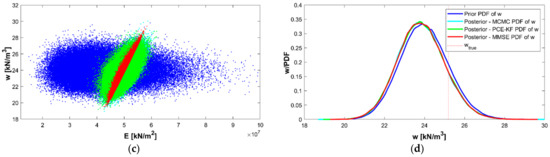 When the step is not accepted, then the sample point is the same as the previous sample point of . The process is repeated till the equilibrium distribution is reached. The speed of the convergence may significantly depend on the initial step. Because the beginning of the chain is still influenced by the starting point, it is common to exclude a few starting samples from the chain, the so-called “burn in period” [24]. In order to improve the efficiency of the MCMC method, the introduced PCE surrogate model can be used, instead of using the computationally expensive FE solver, for all the samples [53].