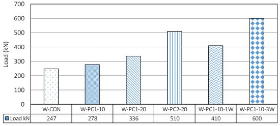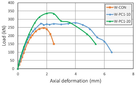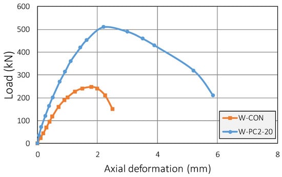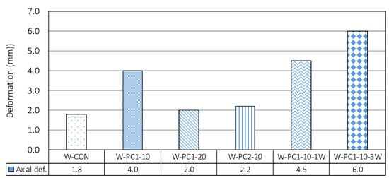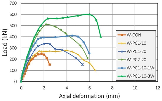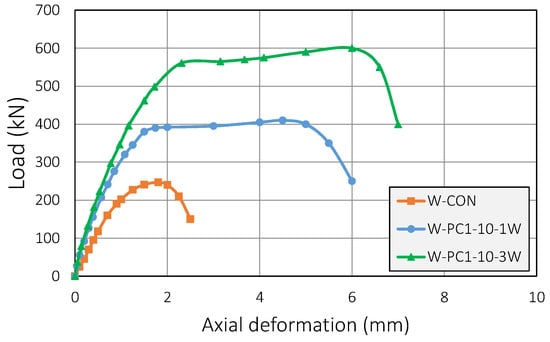 - For the cement mortar and wire-mesh-strengthened walls, i.e., W-PC1-10-1W and W-PC1-10-3W, the ultimate axial deformation was increased by 150% and 233%, respectively, as compared to the control wall, i.e., W-CON.