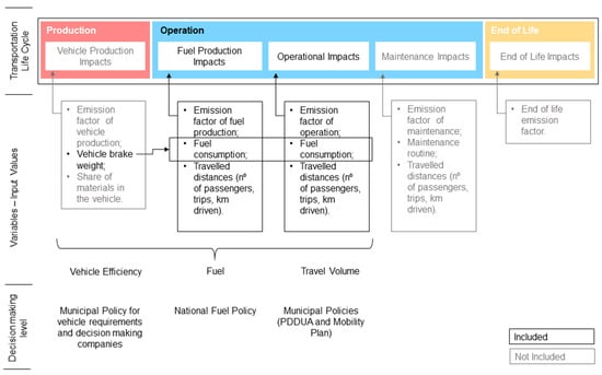 Life cycle phases with the respective variables susceptible to changes by public policies for mitigation purposes. Based on Garcia et al. (2015).