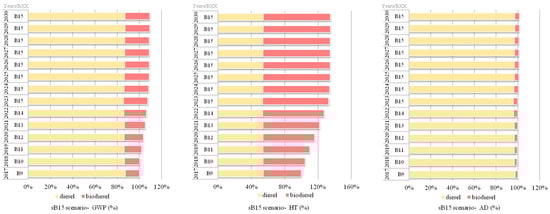 Considering the sB15 scenario, the total and percentage impacts of diesel decrease over the years with the gradual replacement of biodiesel until 2023, when the increase in percentage of biodiesel in the mix ceases. However, it is important to highlight that the impact of diesel is the most representative throughout all the years considering that its percentage contribution in the analysis is quantitatively greater; in GWP it amounts to 79.7% with approximately 1.41 × 108 kg CO2-eq. in 2030. The impact of biodiesel corresponds to just over 20.3% with around 3.59 × 107 kg CO2-eq. in the same year. Moreover, for the HT sB15 scenario, our findings show that by 2017 diesel encompasses 54.7% (about 8.01 × 106 kg 1.4-DB-eq.) and biodiesel almost 45.3% (about 6.64 × 106 kg 1.4-DBeq.) of impacts. In contrast, regarding the AD sB15 scenario, a clear differentiation can be observed compared to the previous impact categories analyzed.