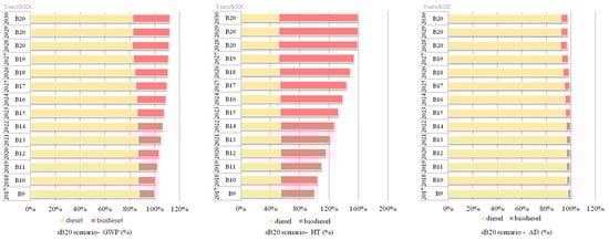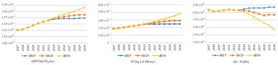 In the following scenarios, there is a change in the diesel composition that is foreseen for up to 20 or 30% of biodiesel beginning in 2023. From there on, the impacts tend to increase or slightly decrease depending on the impact category observed. Regarding the sB20 scenario, for both GWP and HT, diesel and biodiesel reached their lowest impact in the base year of 2017. In contrast, considering AD, the lowest total impact found was in 2028, a year in which there is no replacement of vehicles and use of B20. Furthermore, sB20 shows that the GWP impact increases from 1.61 × 108 kg CO2-eq. in 2017 to about 1.81 × 108 kg CO2-eq. in 2030, in which biodiesel encompasses 26.5% of the GWP impact. According to the GWP, HT increases its total emissions over the years from almost 1.47 × 107 kg 1.4-DB-eq. in 2017 to more than 2.34 × 107 kg 1.4-DB-eq. in 2030 in the sB20 scenario. As happened in GWP, the total and the percentage impacts increased over the years, but it is evident that the same happened in HT much more significantly. Whereas in GWP, the total impact increased by 11.9% in HT and there was a 59.4% increase between 2017 and 2030 as seen in Figure 3.