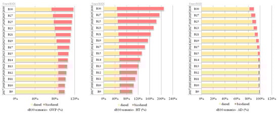 Similarly, in scenario sB30, the highest GWP impact values are at the end of the period (2030) showing an increase in biodiesel at its highest in the mix. Between the base scenario in 2017 and the scenario that considers fuel, vehicles substitutions, and efficiency changes, there is an emission difference of 2.89 × 107 kg CO2-eq. by 2030. This difference represents an increase of 17.9% in GWP emissions from 2017 and 2030. As in the previous scenario, the impacts of HT in sB30, both the total and percentage impacts, increase over the years, from 1.47 × 107 kg 1.4-DB-eq. in 2017 to 3.06 × 107 kg 1.4-DB-eq. in 2030 with an increase of approximately 109.0% between 2017 and 2030. Regarding AD from 2017 to 2030 there is a reduction of approximately 10.4% of impacts. In this case, 2030 is the year with the least accounted for impact, about 1.82 × 109 MJ. In comparison, 2017 and 2021 are the years in which we identified the highest impact values, both at 2.03 × 109 MJ, even considering that in 2017 there were no changes in the fleet and the use of B9 in the mix. In 2021, 160 vehicles were replaced. Thus, considering AD, the low percentage of biodiesel adhered to the mixture and a large number of replacements negatively influence the final results. The results demonstrate the potential of renewable fuels related to the reduction of abiotic depletion, which is an obvious conclusion considering the replacement of diesel, a fossil fuel, in the scenarios by such a renewable source.