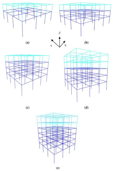 (a) Two-, (b) three-, (c) four-, (d) five- and (e) six-story mixed r/c-steel buildings (lower r/c and upper steel parts shown with blue and cyan colors, respectively).
