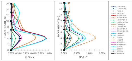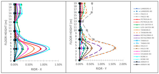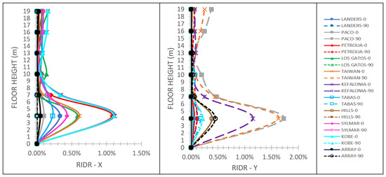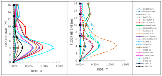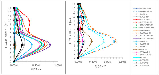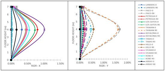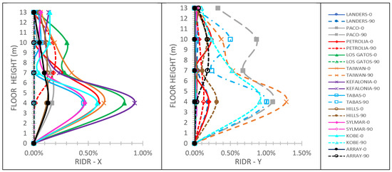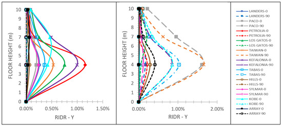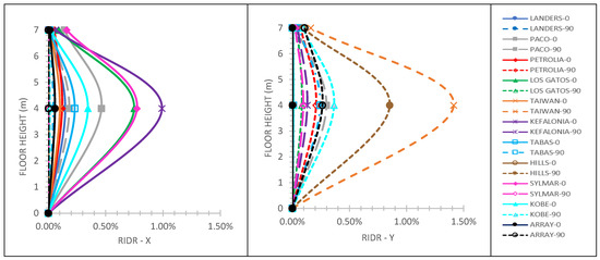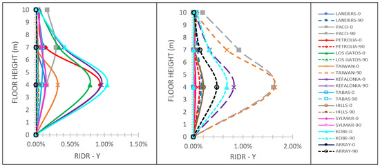 RIDR along X (left) and Y (right) horizontal directions of the two-story mixed building, considering the fixed-pinned connection of the steel structure to the r/c one.