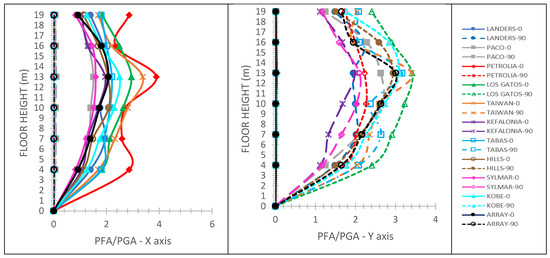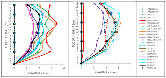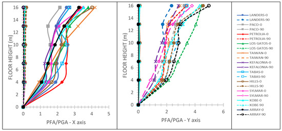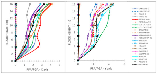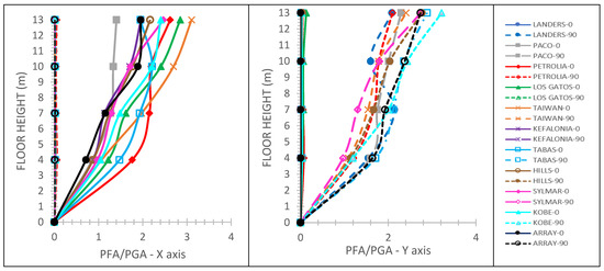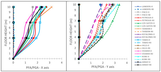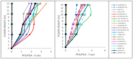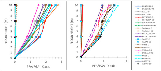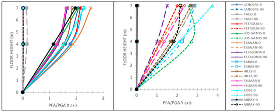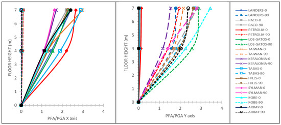 PFA/PGA along X (left) and Y (right) horizontal directions of the three-story mixed building, considering the fixed connection of the steel structure to the r/c one.