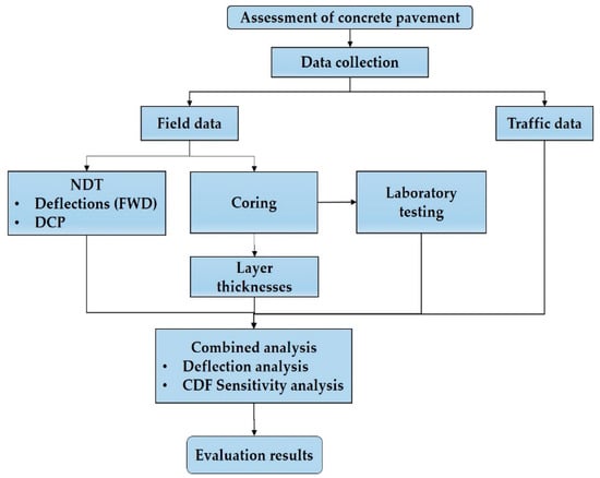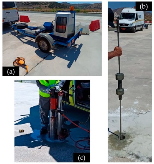 Based on the methodology described in Figure 1, an experimental process was developed, which included (i) NDT data collection in the field with a Dynatest FWD system (Figure 2a) and a Dynamic Cone Penetrometer (DCP) (Figure 2b), (ii) sample coring (Figure 2c) for thickness assessment and concrete material characterization and (iii) combined performance analysis considering traffic data. Both FWD and DCP testing were performed in accordance with relevant specifications and standards [22,23].