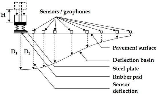 The FWD is a powerful method for evaluating the structural integrity of pavement layers and the subgrade [6,24,25,26]. The principle is to generate a load impulse by dropping a known mass from a given height onto a loading plate, through which the load is transmitted to the pavement structure. This results in a typical deflection response, such as the one shown in Figure 3. Multiple load levels can be applied to the pavement by adjusting the drop height (load levels) according to the predefined load levels for the LTPP FWD test [25]. The resulting vertical deflections of the pavement are recorded by a series of geophones spaced at predefined intervals along a radial axis from the loading plate.