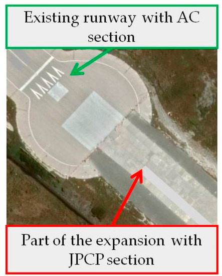 The test site that was used for data collection (shown in Figure 4) includes an Asphalt Concrete (AC) runway pavement of a regional airport with strategic importance for the southeast European area. Based on increased tourist flows that have raised the aircraft type demands the previous years, the airport authorities planned to expand the existing AC runway with new pavement construction. Part of the expansion corresponds to the JPCP section (as shown in Figure 4), including slabs with concrete of type C30/37 laying on crushed-stone granular subbase. The pavement foundation consists of natural soil. The investigation focuses on the JPCP section.