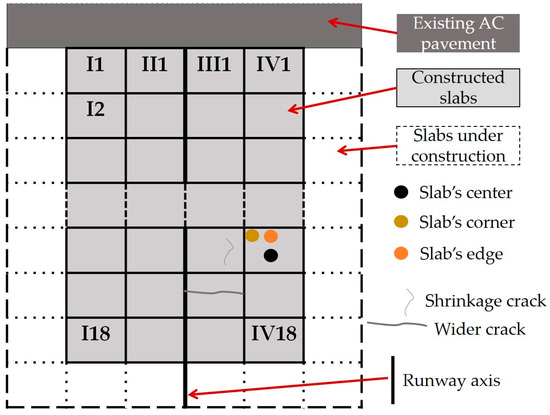 The pavement construction started from the runway axis and moved outwards. Based on the construction history, it is known that it took place during dry summer conditions and shrinkage cracks appeared at several locations along some concrete slabs a few weeks after (Figure 6). Moreover, several concrete thickness variations were observed. As such, parallel to the construction activities, the undertaken experiment planned to evaluate the condition of the so far constructed pavement consisting of four lanes (Figure 7).