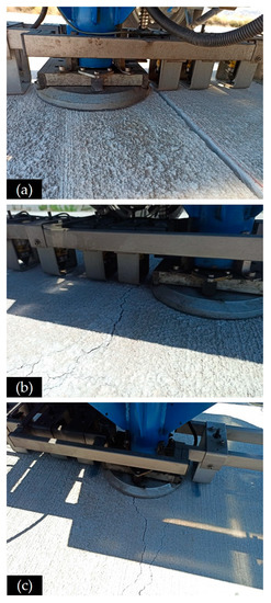 In addition, the presence of cracks at several locations (as indicatively shown in Figure 8) stimulated the execution of additional FWD measurements. These were taken (i) around cracks (Figure 9b) and (ii) directly on cracks (i.e., at a location where the crack was directly under the loading plate as per Figure 9c), in order to evaluate the cracks’ LTE and how the pavement’s response differentiates because of cracking, respectively.
