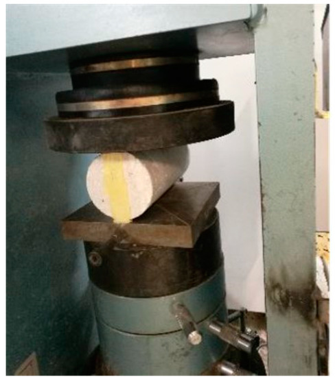 Besides data collection in the field, ten cores were extracted at several locations in order to cover the investigation area to the maximum possible extent. The purpose of coring was twofold. Firstly, pavement evaluation required the knowledge of the as-built material layer thicknesses in order to obtain a more complete understanding of a pavement’s behavior. Secondly, since pavement long-term performance strongly depends on concrete’s flexural strength, the extracted cores from intact locations (i.e., without cracks) were further tested in the laboratory to estimate concrete’s material characteristics. In particular, the cylindrical cores were subjected to a standardized test for the determination of the splitting strength [29]. According to the Wykeham Farrance configuration shown in Figure 10, a compressive loading rate of 0.7 kN/s was imposed on each tested core and the splitting tensile strength ( in MPa) was determined according to the following equation: