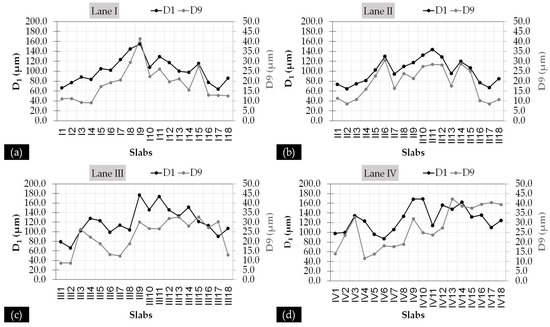 Defection records along the investigated slabs are given in Figure 11, where the FWD deflection indexes D1 and D9 are given. D1 is the deflection recorded at the center of the loading plate and reflects the overall pavement condition. D9 is the deflection recorded from the outer geophone at a distance of 1800 mm from the center of the loading plate and reflects the pavement substructure condition.
