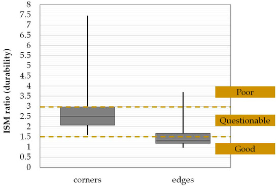 With respect to the durability assessment of the concrete pavement, ISM ratios are given in the form of boxplots in Figure 12. The internal line in each boxplot corresponds to the median value of the tested sample. As can be seen, concrete durability at the corners is not satisfactory, while at the edges, the condition appears to be partially improved. In general, durability-related issues may be a result of improper mix composition, poor construction or presence of moisture beneath the slabs. Considering that the investigated pavement has not been given to traffic, the detection of durability-related aspects at this stage is an indication that such problems will be intensified in case of slabs’ exposure to aircraft loading in accordance with remarks from past studies [21].