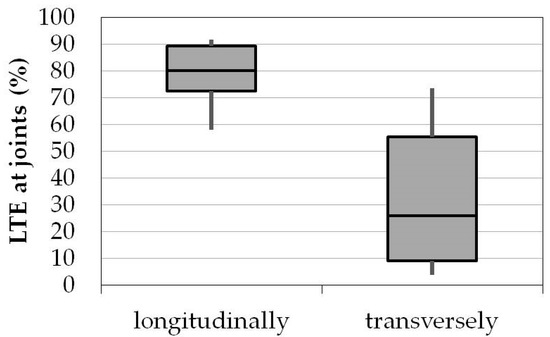 These remarks were strengthened considering the LTE assessment at joints and cracks. With respect to joints, sample measurements were made both longitudinally and transversely and the LTE results are given in Figure 13. Longitudinal joints have a lower ability to transfer loading between adjacent slabs (transverse direction) compared to the transverse joints (longitudinal direction). Poor LTE in the transverse direction may be related to faulting issues [35] that were also observed in the investigated pavement from the visual inspection process. However, low LTE at new pavements might not be a common issue. Moreover, further deterioration can be anticipated because of the aircraft movements, especially when the longitudinal axis of an aircraft becomes misaligned with the runway centerline. In such a case, the LTE transversely is expected to be critical.