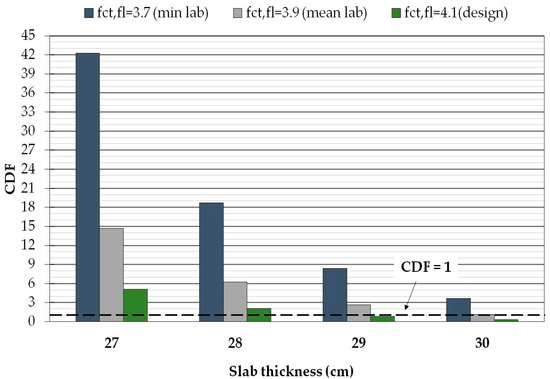 The analysis results are presented in Figure 14 in terms of the predicted CDF. The analysis highlights the importance of appropriate selection of input values during the evaluation procedures. More specifically, the selection of mean values of concrete thickness (30 cm) and mean concrete strength (3.90) leads to adequate structural capacity of pavement, while the conservative selection of concrete thickness (mean minus one standard deviation) leads to extremely high CDF values.