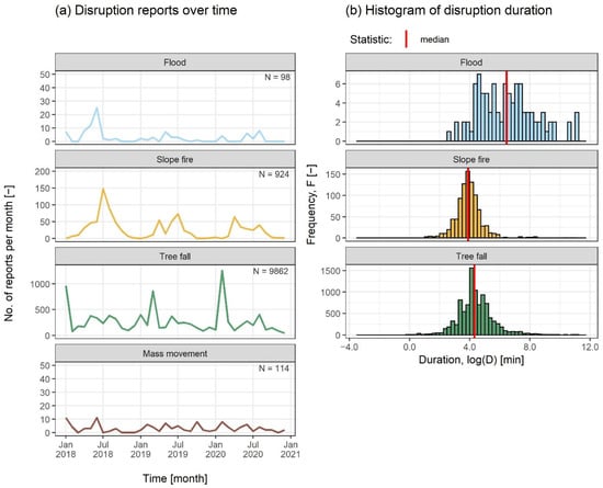 Statistics on natural hazard events: (a) disruption reports over time by type of natural hazard; (b) histogram of disruption duration. Note: For mass movements, no information on disruption duration was provided.