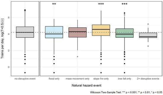 Box plots of train-count distributions by natural hazard event compared to the distribution of days with no disruptive event (leftmost plot). Asterisks indicate the level of statistical significance of the Wilcoxon two-sample test between the natural hazard event and no disruptive event. Data are based on the continuity-corrected log-transformation of trains per day, as shown in Figure 1.